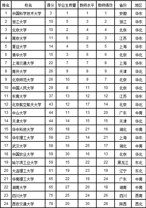 將滿(mǎn)足上述3項(xiàng)條件的大學(xué)的3項(xiàng)排名名次相加后升序排列,得分越低越好。得分相同,教師平均學(xué)術(shù)水平高的大學(xué)居前。