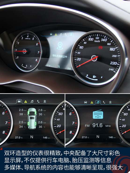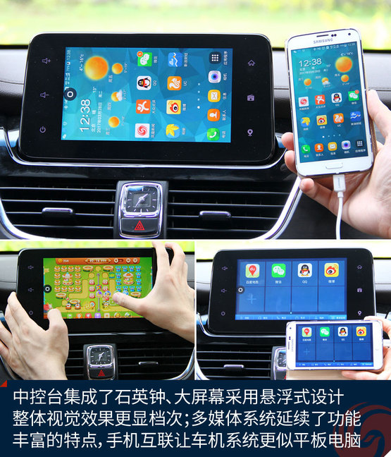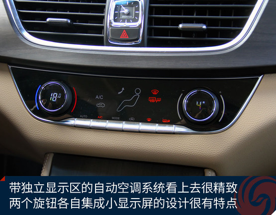 中控臺中央的大尺寸液晶屏顯示效果挺贊,高清屏、亮度高、色彩艷麗,功能上也足夠強(qiáng)大,收音機(jī)、藍(lán)牙免提、影音播放、GPS導(dǎo)航等等非常全面,前后雷達(dá)、360全景影像也能夠在這里清晰顯示,只可惜手機(jī)互聯(lián)僅支持安卓系統(tǒng),希望日后能有所完善。下方的自動空調(diào)控制區(qū)很精致,也很顯檔次。