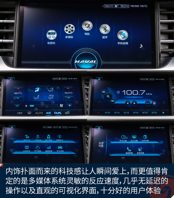 如果說外觀給了你第一重驚喜,那么內(nèi)飾的設(shè)計一定超乎了你對自主品牌的認知,至少我認為,全新哈弗H6上的這套內(nèi)飾,在設(shè)計上已經(jīng)超越了很多合資品牌。撲面而來的科技感讓人瞬間愛上,而更值得肯定的是這套多媒體系統(tǒng)靈敏的反應速度,幾乎無延遲的操作以及直觀的可視化界面,都帶來十分好的用戶體驗。