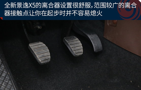 對于手動擋車型而言,除了變速器本身外,還有一個部件十分重要那就是離合器,一個調(diào)整的十分舒適的離合器可以給駕駛者帶來更好的駕駛感受。全新景逸X5的離合器設置很舒服,雖然從腳感來說,它的離合器設定有些偏沉,但不要擔心,范圍較廣的離合器接觸點讓你在起步時并不容易熄火。