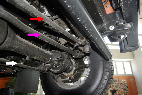 ????前軸特寫二,玫紅色箭頭為橫向推力桿,紅色為轉(zhuǎn)向拉桿,白色的拉桿連接左右的羊角,紅色的轉(zhuǎn)向拉桿帶動(dòng)衛(wèi)士的右前輪轉(zhuǎn)向,通過(guò)白色的拉桿聯(lián)動(dòng)左前輪,使左右前輪同步的進(jìn)行轉(zhuǎn)向。