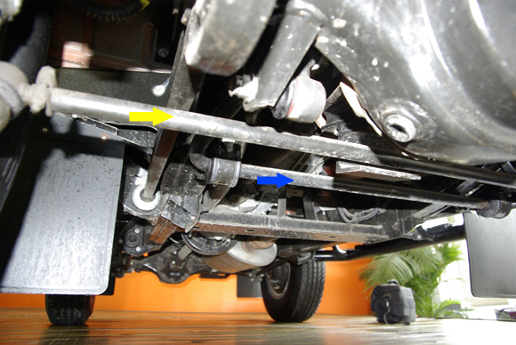 ????上圖中橙黃色箭頭為前軸的限位拉桿,不僅限制前軸自身發(fā)生扭轉(zhuǎn),也可對(duì)前軸的相對(duì)車架的前后位置進(jìn)行限制。藍(lán)色箭頭為前防傾桿,目測(cè)粗細(xì)并不算大,相信這也跟衛(wèi)士不看重公路性能有關(guān)。