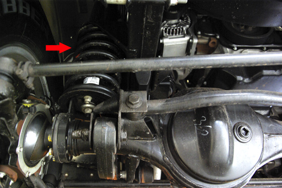 ????后軸特寫圖二,藍(lán)色箭頭所指為拖臂,紅色箭頭所指為后防傾桿,對(duì)于衛(wèi)士的車重而已,其粗細(xì)不能提供很好的仿側(cè)傾效果。后軸依然采用螺旋彈簧作為彈性元件。