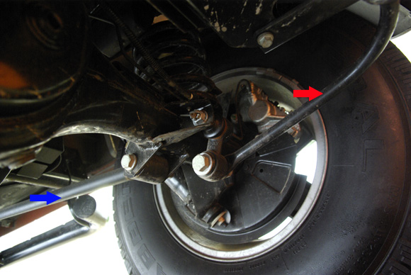 ????衛(wèi)士的后軸采用拖臂式后懸,紅色箭頭所指的拉桿就是拖臂。左右各一根,拖臂及避震機(jī)對(duì)后軸的自由度進(jìn)行控制,后軸相對(duì)車架的位置和自身的扭轉(zhuǎn)都得到了控制。