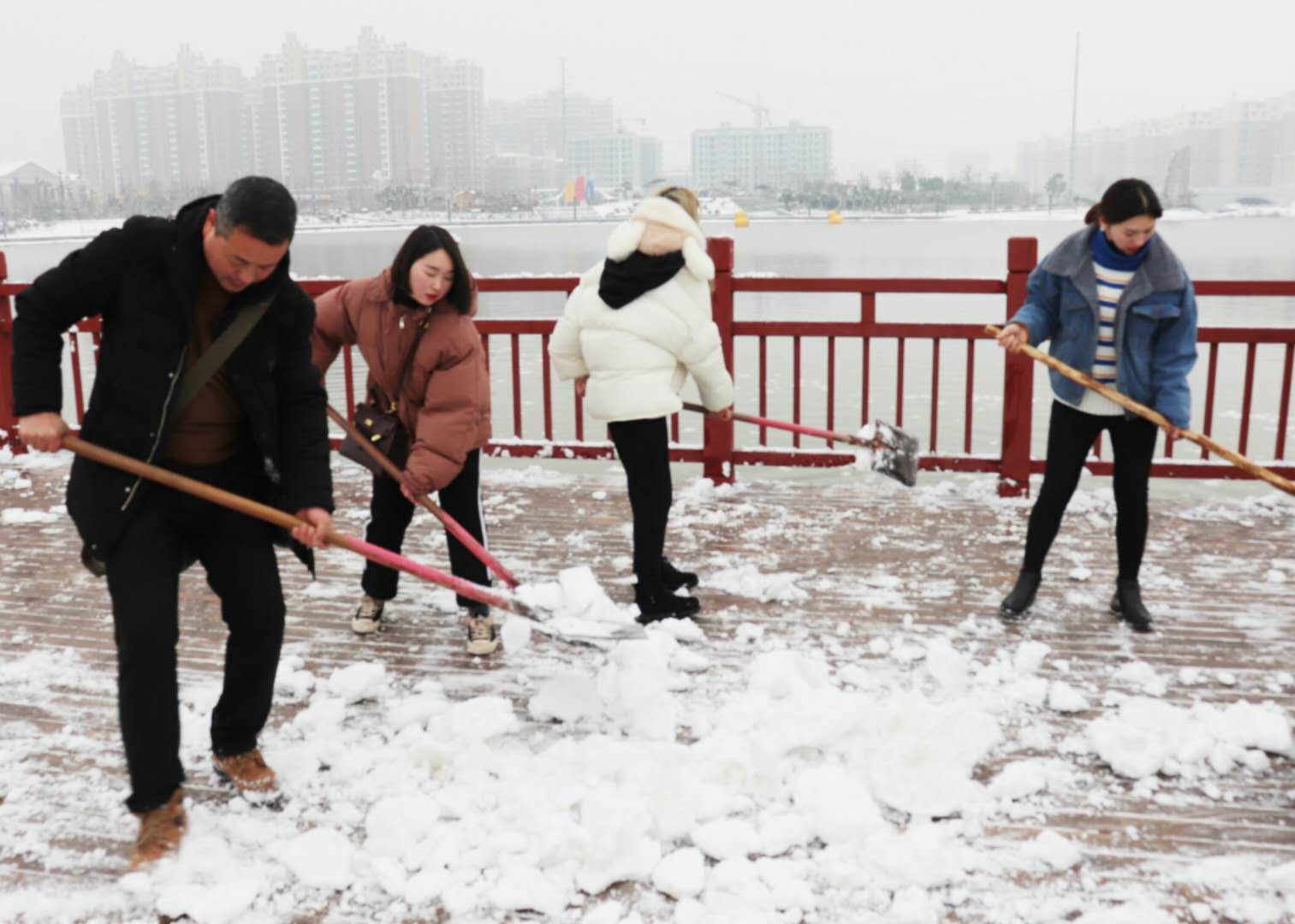 經(jīng)過兩場(chǎng)大雪的洗禮,空氣格外清新,但鹿邑上清湖公園內(nèi)積雪嚴(yán)重,且已結(jié)冰,給市民游園帶來了諸多不便和隱患。從早晨到下午4點(diǎn)半,鹿邑市政園林中心的干部職工和道德公益志愿者在上清湖集合后,投入鏟雪掃雪行動(dòng),經(jīng)過一天的緊張清掃,上清湖湖面棧道和園內(nèi)公路上的積雪清掃一遍。道德公益志愿者鐘華在微信群里提出建議后,有十幾位志愿者報(bào)名參加上清湖義務(wù)掃雪活動(dòng)。