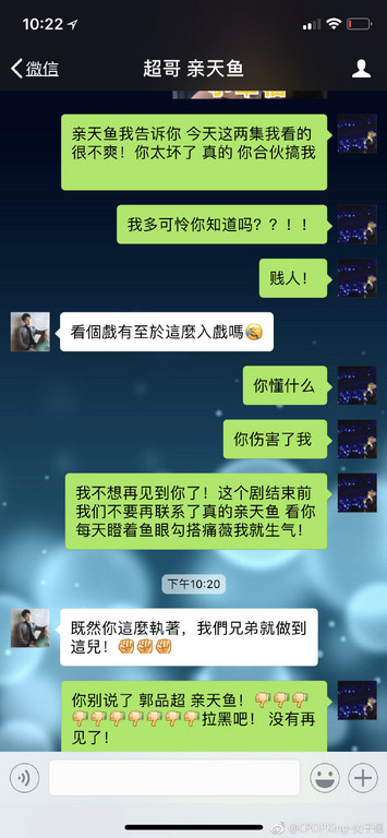 這讓郭品超也非常無奈,響應(yīng):“看個戲,有至于這么入戲嗎?”隨后黃子韜似乎還無法消氣,激動表示:“我不想再見到你了!這個劇結(jié)束前,我們不要再聯(lián)系了,真的親天魚(秦天宇),看你每天瞪著眼、勾搭痛薇(童薇,楊冪劇中角色)我就生氣!”郭品超也只好同意:“既然你這么執(zhí)著,我們兄弟就做到這兒!”兩人一來一往逗趣對話,逗樂不少粉絲,調(diào)侃:“別的演員發(fā)微博是宣傳,他是真的在追劇”、“追得比粉絲還激動”、“這是用生命在追劇”,意外引起一陣熱議。