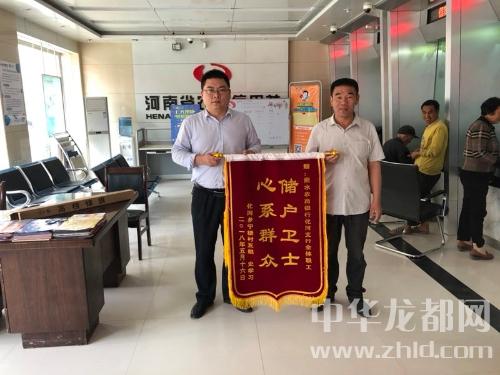 中華龍都網(wǎng)訊(周口報業(yè)全媒體記者 付永奇 通訊員 高少輝)5月24日上午,商水縣化河鄉(xiāng)村民史學(xué)習(xí)和村支書一同來到商水農(nóng)商銀行化河支行,為該支行送來一面“儲戶衛(wèi)士 心系群眾”的榮譽(yù)錦旗,感謝該支行幫其找到丟失的現(xiàn)金。