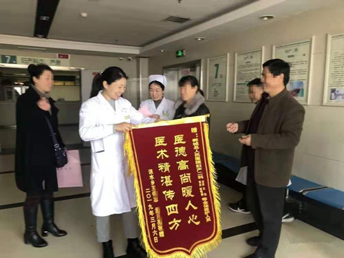 術(shù)后患者恢復(fù)良好,康復(fù)出院后,3月6日上午,患者和丈夫一起來到醫(yī)院,向住院期間給予了精準(zhǔn)治療和細(xì)心護(hù)理的婦產(chǎn)二科王皓主任、張明偉醫(yī)生及全體醫(yī)護(hù)人員贈送錦旗,以表謝意。