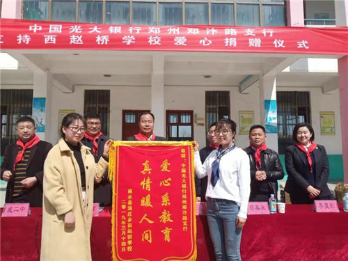 3月14日上午,陽光明媚,春意盎然。中國光大銀行鄭州鄭汴路支行向商水縣湯莊鄉(xiāng)趙橋學校愛心捐贈儀式在趙橋學校內舉行。河南省委組織部駐西趙橋村第一書記楊永,商水縣教體局負責人鄭春來、湯莊鄉(xiāng)黨委書記潘建甫等出席捐贈儀式。