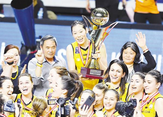 5月5日,瓦基弗銀行隊球員朱婷(中上)邀請父母進入球場慶祝奪冠。 當(dāng)日,在2018-2019賽季土耳其女排超級聯(lián)賽決賽第五回合比賽中,瓦基弗銀行隊客場以3比0戰(zhàn)勝伊薩奇巴希隊,以總比分3比2成功衛(wèi)冕聯(lián)賽冠軍。朱婷也蟬聯(lián)了聯(lián)賽MVP(最有價值球員)稱號。 新華社記者 徐速繪 攝