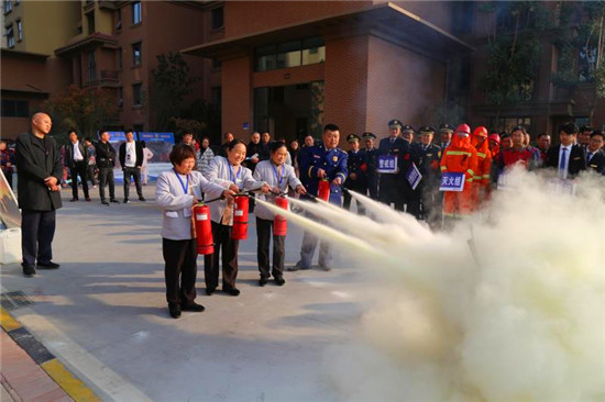 記者在現(xiàn)場看到,隨著消防警鈴的響起、煙霧的彌漫,來自物業(yè)公司和社區(qū)的數(shù)十名群眾彎著腰,同時用濕毛巾捂著口鼻,緊急而有序地從步梯撤出,與此同時,消防隊員迅速將消防水袋和槍頭同消防栓相連接,并打開消防栓對準“火勢”,一瞬間,發(fā)生在建業(yè)社區(qū)的一場“火災”被及時撲滅,現(xiàn)場圍觀的眾人爆發(fā)出陣陣掌聲。