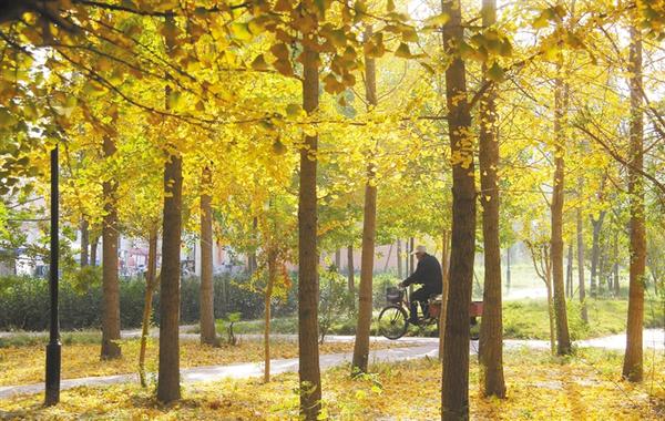 近日,周口市經(jīng)濟(jì)開發(fā)區(qū)人民廣場,金黃色的楊樹葉在陽光照耀下熠熠生輝,給城市增添一抹亮色。張振海 攝