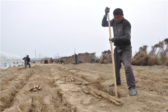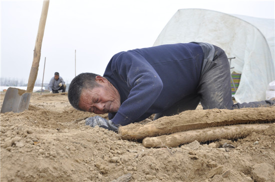 11月26日,沈丘縣白集鎮(zhèn)40多歲的耿金中與另外兩個同伴一起來到周口城鄉(xiāng)一體化示范區(qū)許灣鄉(xiāng)肖王莊,未來的一段時間,他們吃住都將在這里進(jìn)行,直到將這一區(qū)域的山藥挖完。耿金中說,他挖山藥已經(jīng)有20多年了,20多年前,沈丘縣大規(guī)模種植山藥,每到收獲時,會有很多山東挖山藥工人來這里挖山藥。他看到這個行當(dāng)能賺錢,就開始學(xué)挖山藥技術(shù)。此后的多年,他先后到山西、湖北、安徽等地挖山藥。