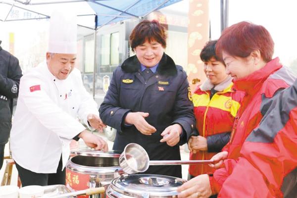 1月2日,在太康縣城人民廣場,來自社會各界的志愿者為環(huán)衛(wèi)工人端上熱氣騰騰的包子和臘八粥,讓環(huán)衛(wèi)工人溫暖過節(jié)。圖為臘八粥發(fā)放現(xiàn)場。
