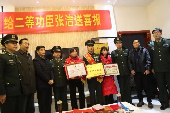 當(dāng)日上午,張潔的老家鑼鼓喧天,熱鬧非常。軍地領(lǐng)導(dǎo)在鄉(xiāng)親們熱烈地掌聲和鑼鼓聲中,帶著滿滿地祝福,專程趕到張潔家中。“張潔同志,在國(guó)際軍事比武競(jìng)賽中取得第一名,榮立二等功為此特向您報(bào)喜。希望您今后多與部隊(duì)聯(lián)系,多給予張潔同志鼓勵(lì),為實(shí)現(xiàn)中華民族偉大復(fù)興的強(qiáng)國(guó)夢(mèng)、強(qiáng)軍夢(mèng)共同奮斗?!痹趶垵嵓抑?,69246部隊(duì)副政委楊富鵬代表組織宣讀了部隊(duì)賀信。
