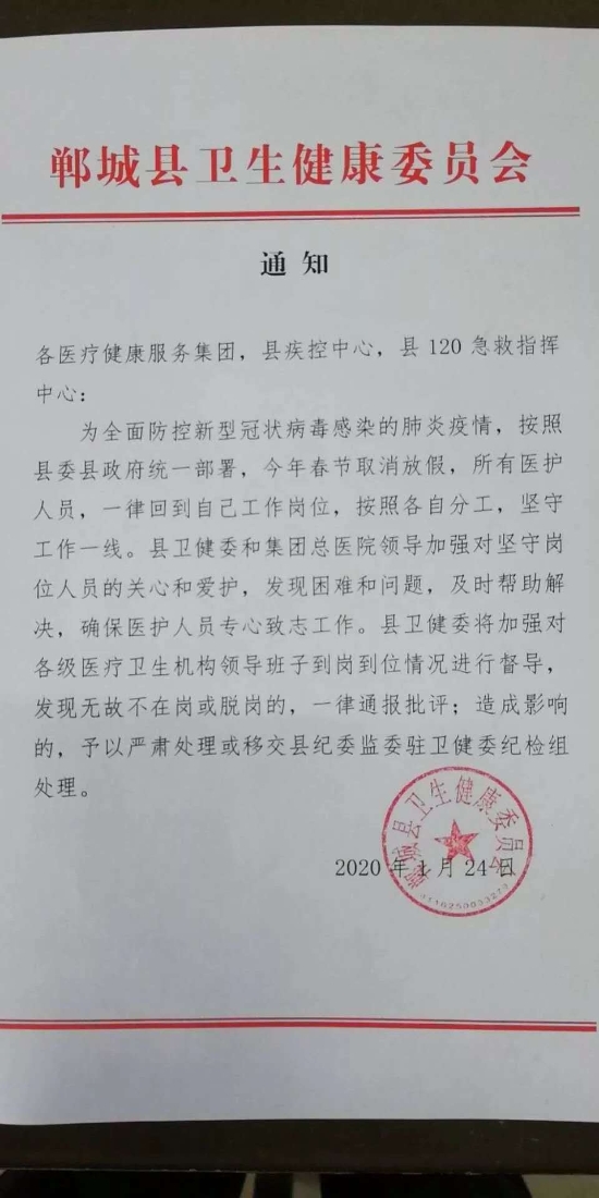 在全國疫情防控形勢較為嚴(yán)重情況下,衛(wèi)健委充分認(rèn)識到加強(qiáng)新型肺炎疫情防治工作的重要性和急迫性,于1月24下發(fā)取消全縣醫(yī)護(hù)人員春節(jié)假期的通知。要求所有醫(yī)護(hù)人員,一律回到自己工作崗位,按照各自分工,堅(jiān)守工作一線。