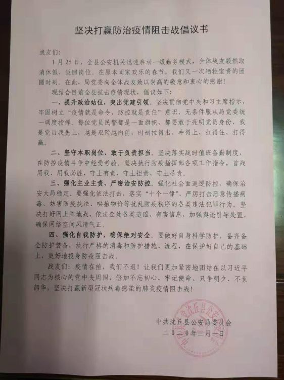 自全省啟動(dòng)抗擊新型冠狀病毒引發(fā)肺炎疫情的一級(jí)響應(yīng)后,沈丘縣公安機(jī)關(guān)迅速啟動(dòng)一級(jí)勤務(wù)模式,在這場(chǎng)舉國(guó)同頻共振的防治疫情偉大斗爭(zhēng)中,突出戰(zhàn)時(shí)黨建引領(lǐng),為堅(jiān)決打贏疫情奠定了堅(jiān)實(shí)的組織保障。
