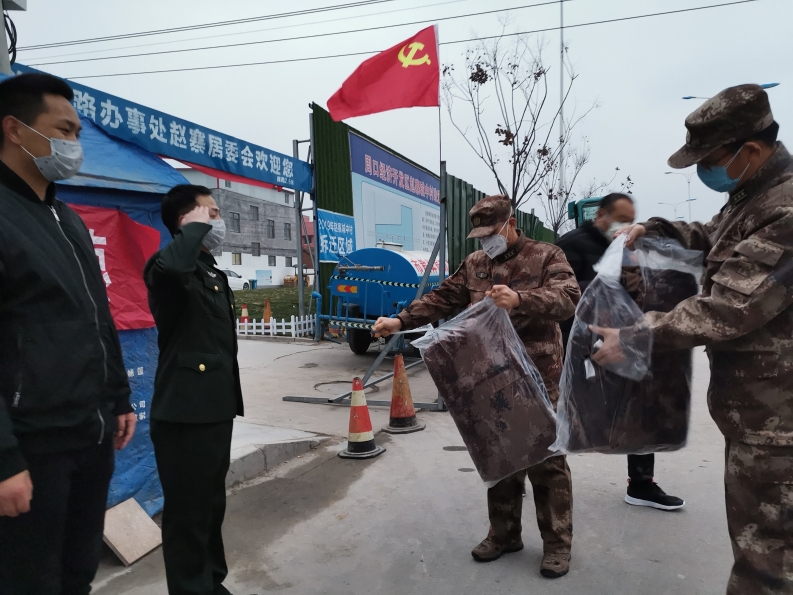 在淮河路辦事處趙寨居委會執(zhí)勤點,探親在家兩名現(xiàn)役戰(zhàn)士趙為為、趙繼周疫情發(fā)生后堅持在防控一線執(zhí)勤點執(zhí)勤。當晚6時許,天色漸黑,了解到這一情況后,部長和政委依然驅(qū)車趕到現(xiàn)場,詳細了解兩名戰(zhàn)士的服役情況,并給他倆每人送了一件軍用大衣,提醒注意自身安全,有啥需求第一時間和武裝部溝通聯(lián)系。
