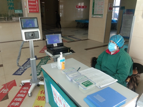 2月18日,記者在周口市中心醫(yī)院急診科看到,一臺醫(yī)用紅外熱像儀出現(xiàn)在急診科的大門口,前來就診的患者必須通過該熱像儀的檢測才能進(jìn)入急診科就診?!扒皝砭驮\的患者只需要在熱像儀前經(jīng)過,熱像儀就會在屏幕上自動顯示患者的體溫信息,一旦出現(xiàn)體溫偏高的人,熱像儀就會自動報警,并不需要人工檢測,提高了檢測效率?!痹谠摕嵯駜x前做紀(jì)錄的醫(yī)務(wù)工作者說。 記者 張洪濤 攝