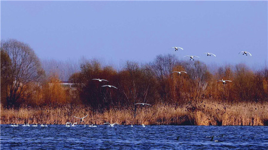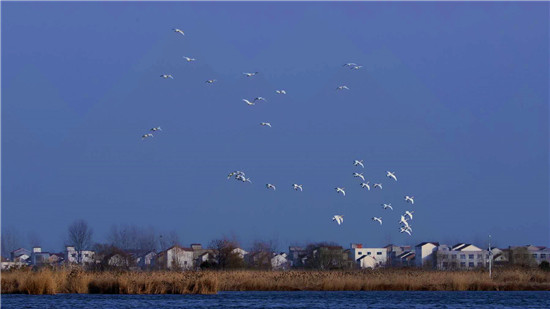 2月21日,50多只白天鵝在國(guó)家濕地公園淮陽(yáng)龍湖自由游弋、展翅翱翔的美麗畫(huà)面被記者一一收入鏡頭。記者現(xiàn)場(chǎng)看到,初春的龍湖,天藍(lán)水碧,萬(wàn)物萌動(dòng)。這群白天鵝的到來(lái),使萬(wàn)畝龍湖一下子變得靈動(dòng)起來(lái)。它們有的在水面上自由覓食,一副悠然自得的神態(tài);有的時(shí)而煽動(dòng)翅膀,抖落長(zhǎng)途跋涉的疲憊;有的飛向藍(lán)天,盡情享受著春日暖陽(yáng)。為了不打擾這群“客人”,又能拍攝到相對(duì)清晰的圖片,記者環(huán)繞龍湖多處踩點(diǎn),用200mm鏡頭+2倍增距鏡,蹲守一天,最終在畫(huà)卦臺(tái)前湖岸向東南方向遠(yuǎn)距離拍攝到了這些美麗的畫(huà)面。