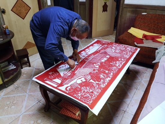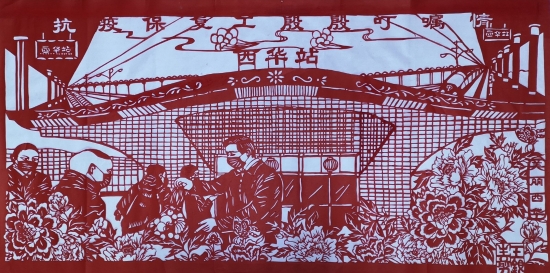 “我在為縣委林書記高鐵站送工創(chuàng)作一幅剪紙作品,你看看效果怎么樣?!苯眨魅A縣奉母鎮(zhèn)剪紙藝人王銀生拿著剛剛創(chuàng)作的剪紙作品讓“疫情防控小分隊(duì)”提意見。