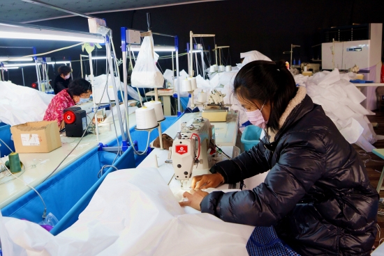 2月25日,項(xiàng)城市南頓鎮(zhèn)水牛劉行政村扶貧車間內(nèi),幾名工人正忙著加工醫(yī)用防護(hù)服。疫情期間,為保障需求,該車間已經(jīng)加班加點(diǎn)完成了2000套醫(yī)用防護(hù)服的訂單任務(wù)。
