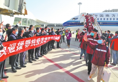 經(jīng)一個(gè)多月的艱苦奮戰(zhàn),453名健康勇士圓滿(mǎn)出色地完成了援助工作任務(wù),平平安安、載譽(yù)歸來(lái)!省衛(wèi)生健康委闞全程主任等領(lǐng)導(dǎo)到機(jī)場(chǎng)迎接,并轉(zhuǎn)達(dá)省委書(shū)記王國(guó)生、省長(zhǎng)尹弘的親切慰問(wèn)。
