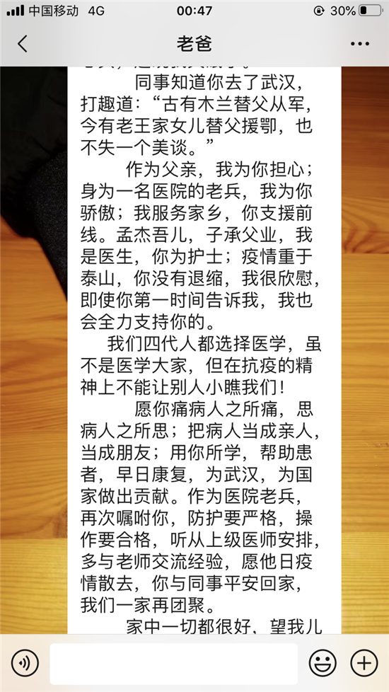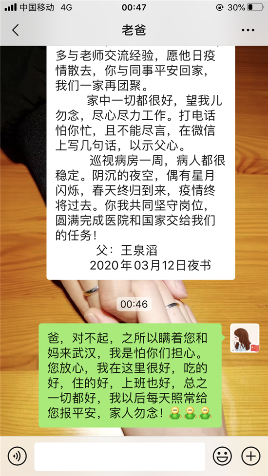 3月21日,周口援鄂醫(yī)療隊出征滿一月。當(dāng)晚,王泉滔通過微信又鄭重給女兒說下這番話:一晃你在武漢一個月了,我和家人從你去武漢的擔(dān)心到現(xiàn)在的放心,這是國家給予我們的安心。農(nóng)民把地種好,教師把學(xué)教好,士兵把國門守好,醫(yī)護(hù)把病治好,都是自己的使命,更是自己的初心。人人懷揣私字,社會必敗,遭殃的終歸眾人;眾人心懷天下,萬物皆勝,受益的定是人人。看到河南部分援鄂醫(yī)療隊從武漢凱旋歸來,雖然沒有你的身影,但是我們很高興,說明武漢的疫情已得到控制,我和家人一起期盼你早日歸來。但是還是要再次叮囑你,不要因為疫情到了最后而放松警惕,上下班路上注意安全,穿脫防護(hù)服不能有一絲懈怠,時刻保持警醒。年前你當(dāng)了姑姑,雖然還沒有見到你侄子,但他和家人共同期待你平安回來。吾兒加油!