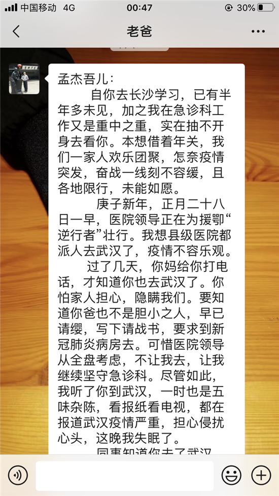 作為父親,我為你擔(dān)心;身為一名醫(yī)院的老兵,我為你驕傲;我服務(wù)家鄉(xiāng),你支援前線。孟杰吾兒,子承父業(yè),我是醫(yī)生,你為護(hù)士;疫情重于泰山,你沒有退縮,我很欣慰,即使你第一時間告訴我,我也會全力支持你的。