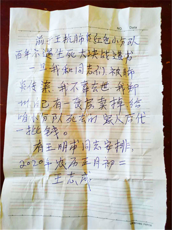 初二晚上,他是邊哭邊寫下遺書。他說,病毒傳染,看不見摸不著,也不知道誰攜帶?更不知道明天大家是個(gè)什么情況,既然動(dòng)員大家沖到抗疫一線,戰(zhàn)死了,他的家人咋辦?他說,他在鄭州有一處房產(chǎn)是養(yǎng)老用的,他害怕自己不幸感染去世了,沒人照顧小分隊(duì)?wèi)?zhàn)死的家人生活,隨寫下遺書,如果出現(xiàn)這種情況,將他的房產(chǎn)賣掉,分給抗疫戰(zhàn)死的隊(duì)員家人。