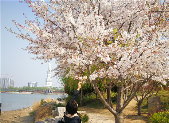 3月24日,周口公園內(nèi)櫻花、海棠、桃花、紫荊花爭相綻放,在綠樹的映襯下,遠(yuǎn)看猶如濃彩重墨的百花圖,不少市民來此賞花游玩。