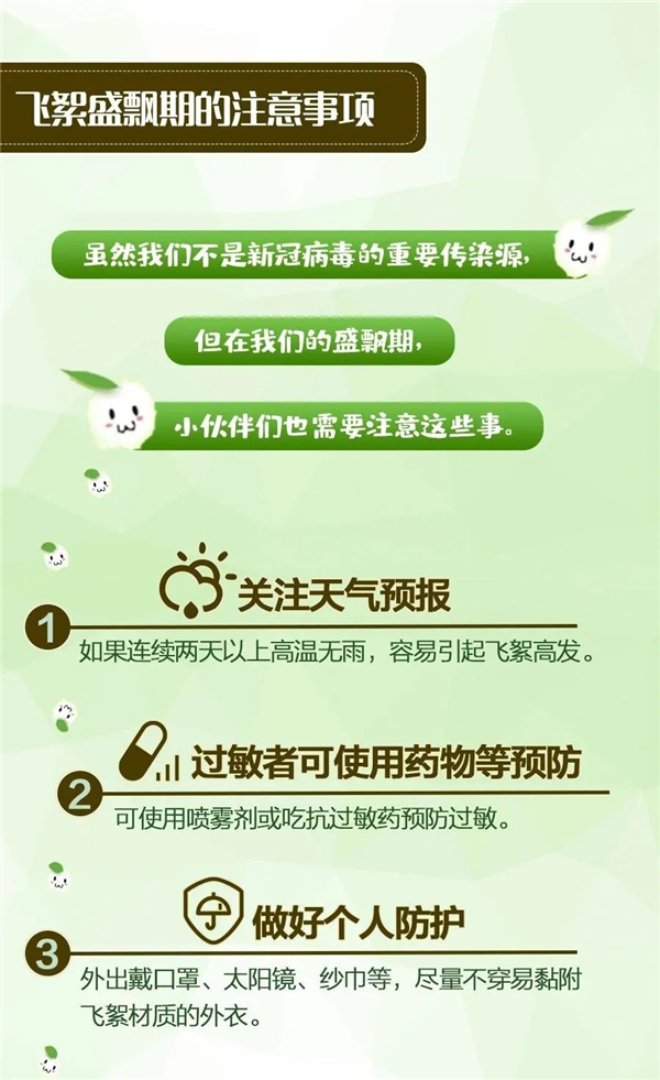 1.無(wú)論是防控病毒,還是防護(hù)楊柳飛絮等花粉過(guò)敏原,現(xiàn)階段都鼓勵(lì)外出時(shí)佩戴口罩。一次性醫(yī)用口罩即可起到防護(hù)作用;外出時(shí)盡量不穿易黏附飛絮材質(zhì)的外衣。