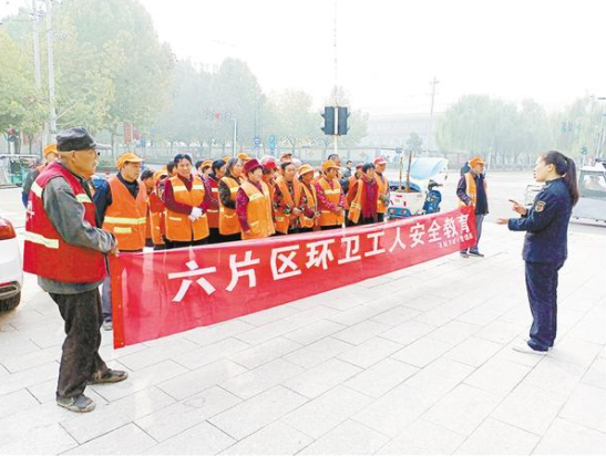 為保障環(huán)衛(wèi)工人的安全,項(xiàng)城市城管局每周二定期對(duì)環(huán)衛(wèi)工人開展安全教育,提醒環(huán)衛(wèi)工人霧天不上主干道、掃地順車道、過馬路注意信號(hào)燈等,增強(qiáng)了環(huán)衛(wèi)工人的安全交通意識(shí)。圖為項(xiàng)城市城管局六片區(qū)負(fù)責(zé)人為環(huán)衛(wèi)工人講解安全知識(shí)。