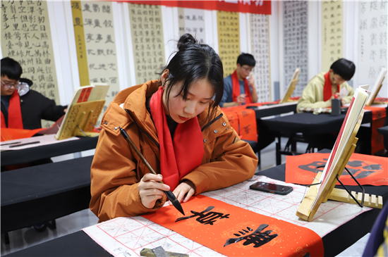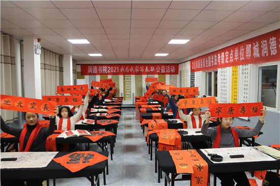 2月3日,記者在鄲城縣潤德書院看到,“我為我家寫春聯(lián)”活動正緊張地進行著,數(shù)十名書法小學(xué)員端坐案前、從容執(zhí)筆、揮毫作書,一個個福字工整又靈活,一副副對聯(lián)娟秀又詩意。孩子們在屋內(nèi)全神貫注地寫字,把最美好的祝福用自己的所學(xué)展示給家庭;家長們在窗外掂腳張望,望子成龍、望女成鳳的心態(tài)表露無遺。