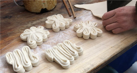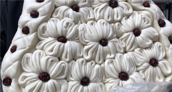 除了平常的白面饅頭,黃師傅還讓妻子現(xiàn)場展示了“棗山”制作,并介紹了棗山的寓意和習俗。“你看這棗山是一層一層的,寓意著步步登高,而且棗山的花形是圓的,代表著團團圓圓。過去出嫁的閨女過年回娘家要帶大饃,娘家要回棗山,現(xiàn)在咱們周口的一些地方還保留著這樣的習俗。”兩位主播體驗了棗山的制作過程,得到黃老板妻子的夸獎:“中!這倆妮兒可巧!”