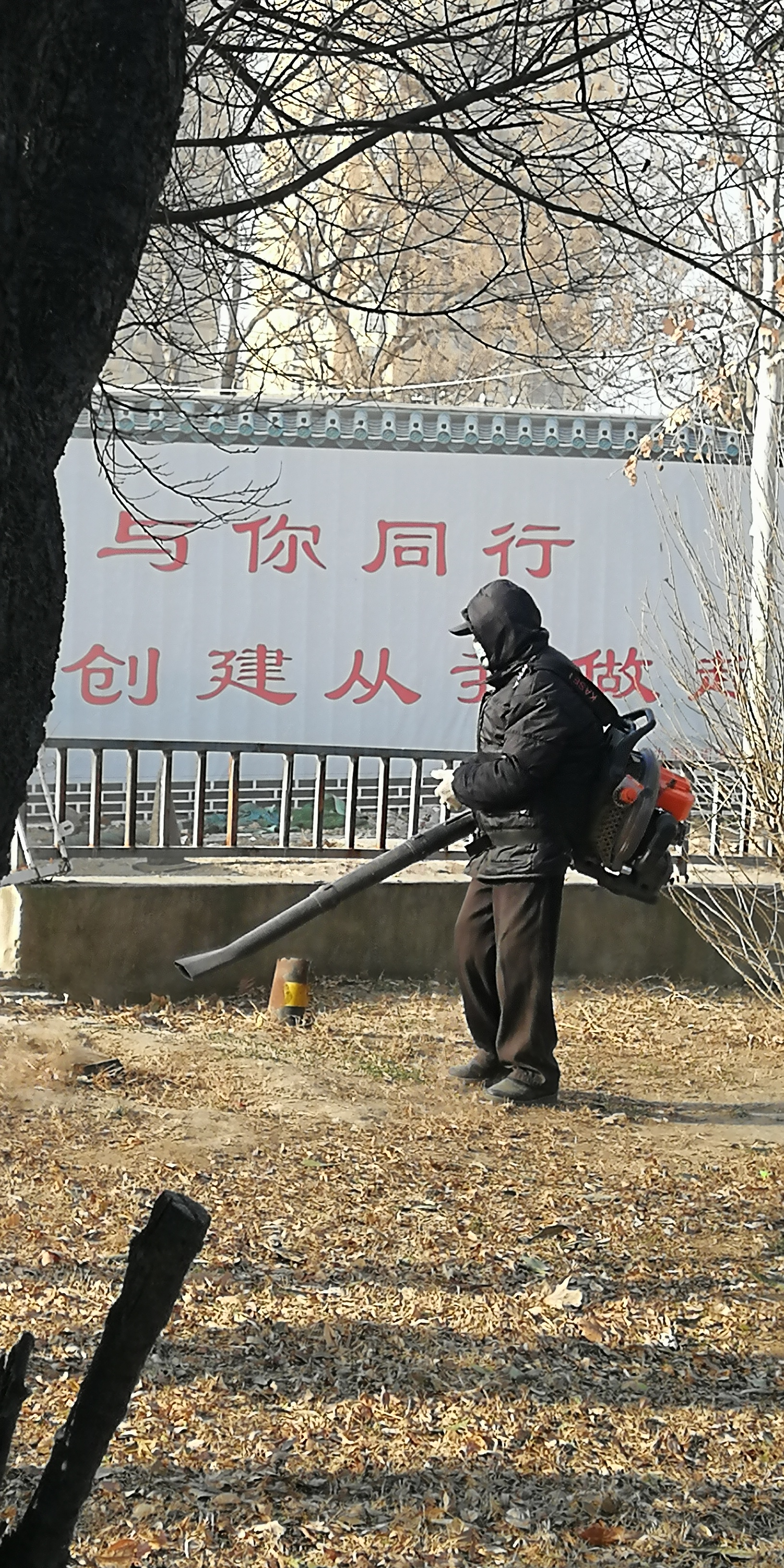 2月11日,大年三十。在川匯區(qū)濱河路上,工作人員背著吹風(fēng)機(jī)清理游園內(nèi)的落葉和垃圾。工作人員介紹,這樣便于更快更好地工作。(周口日報·周道客戶端記者 馬月紅)②7