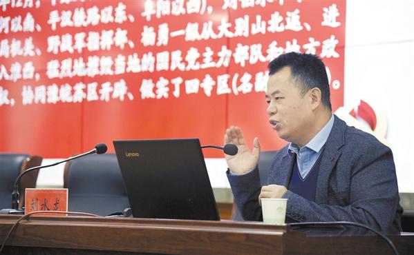 2月26日下午,商水縣舉行學(xué)黨史國史紅色教育大講堂活動。商水籍北大學(xué)子劉水龍結(jié)合史料,精彩講述賀龍北伐在商水播下革命火種、彭雪楓經(jīng)周口東進豫皖蘇燃起商水革命烈火、豫皖蘇軍區(qū)解放周口商水浴火重生,以及火熱革命中涌現(xiàn)出來的商水英烈艾力、趙海靜,支前模范徐乃貞等人的英勇事跡。這些生動鮮活的歷史人物故事,再現(xiàn)了英雄兒女在商水大地上勇于革命、不怕犧牲的紅色革命歷史。劉水龍用豐富的史實、鮮明的觀點、精辟的講述,贏得臺下聽眾陣陣掌聲。記者 付永奇 攝