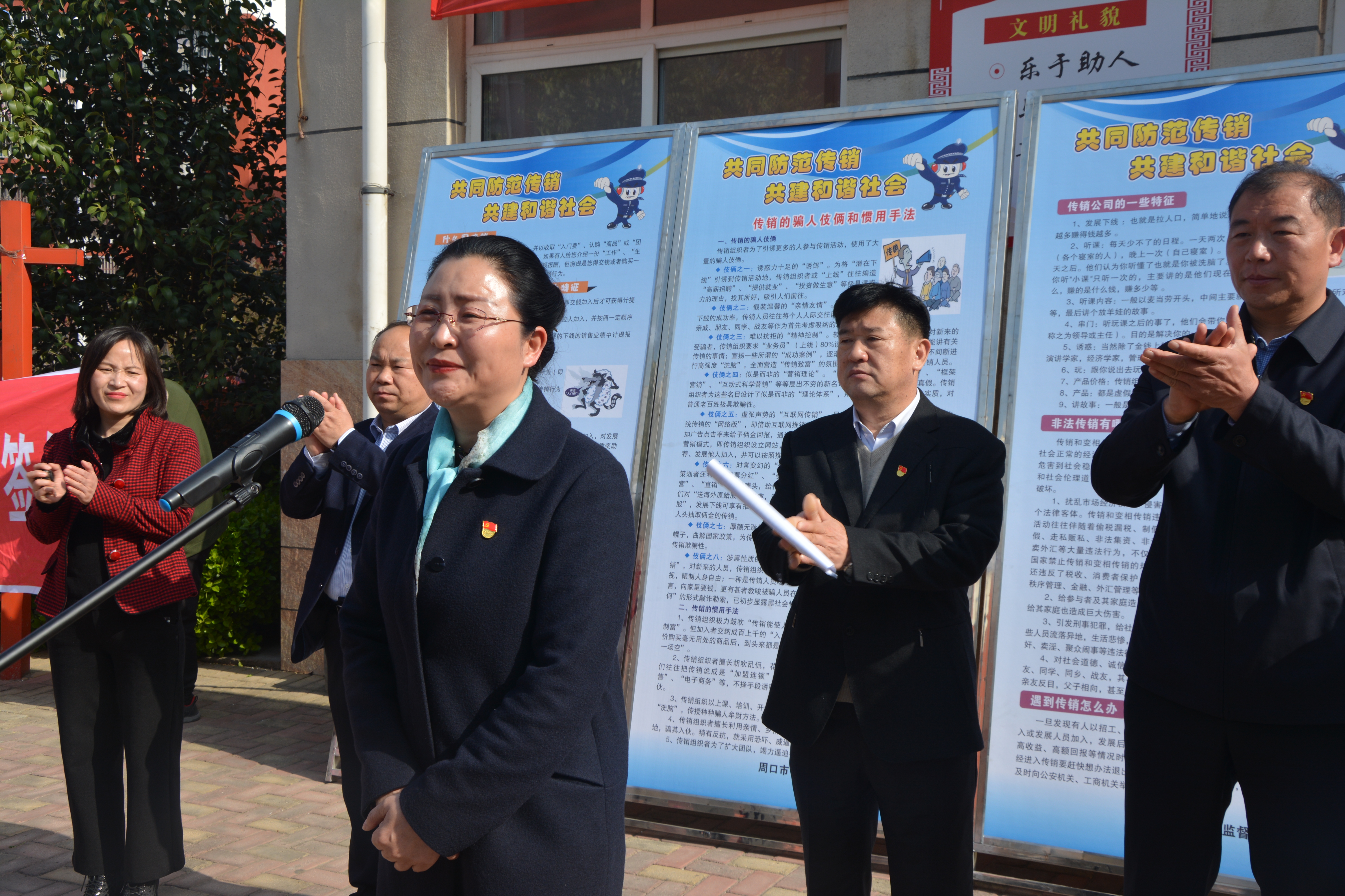 市市場監(jiān)管局二級高級主辦王樹平在啟動儀式上強調,禁止傳銷是全社會責任。市場監(jiān)管部門要充分發(fā)揮職能作用,重拳出擊,嚴厲打擊傳銷違法行為。積極開展線下涉?zhèn)骶€索排查處置,加大新型網絡傳銷打擊力度,廣泛開展無傳銷創(chuàng)建工作。打擊傳銷工作既要注重打擊懲處,又要注重日常監(jiān)管,做到打、防、控同步推進,不斷鞏固打擊成果。港區(qū)分局要堅決落實“四個最嚴”要求,守住安全底線,加大打擊傳銷工作力度,創(chuàng)新監(jiān)管執(zhí)法方式,提高監(jiān)管效能,守市監(jiān)初心,擔發(fā)展使命,服務現代化生態(tài)新港城,為平安港區(qū)建設貢獻市場監(jiān)管力量。港區(qū)打擊傳銷工作領導小組組長、黨委委員、紀委書記李素芹同志宣布周口港區(qū)創(chuàng)建無傳銷社區(qū)活動啟動。