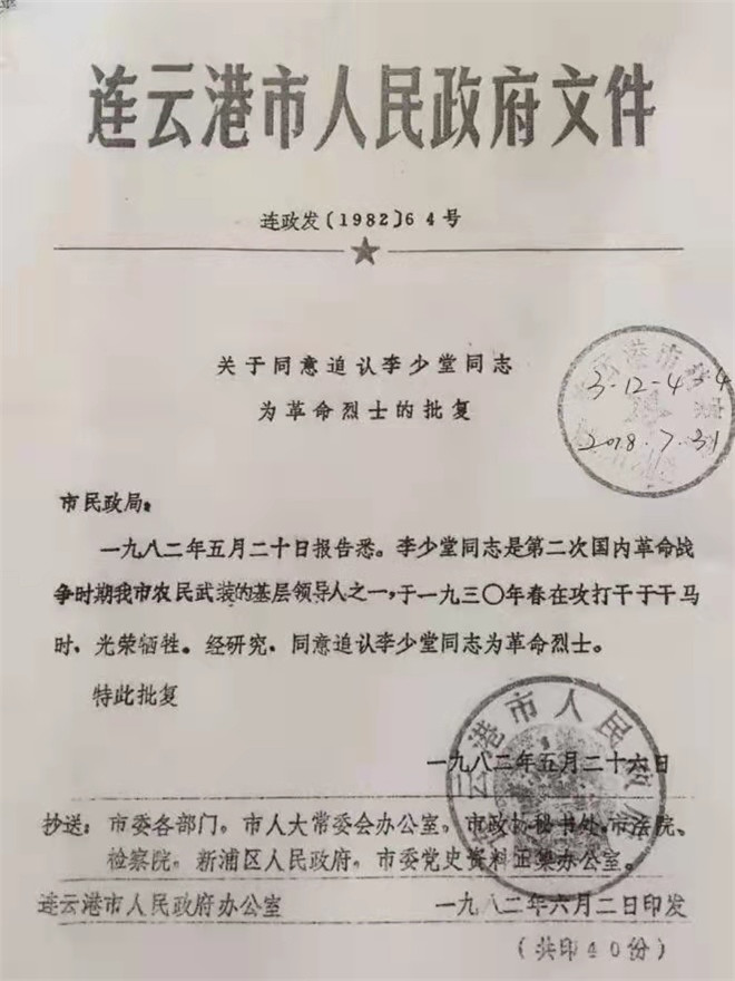 新中國(guó)成立后,李少堂的孫子才聯(lián)系上了李少堂曾經(jīng)的革命戰(zhàn)友惠浴宇同志。時(shí)任江蘇省省長(zhǎng)的惠浴宇同志得知消息后,親寫(xiě)證明遞交黨中央,這才證實(shí)了李少堂的身份。