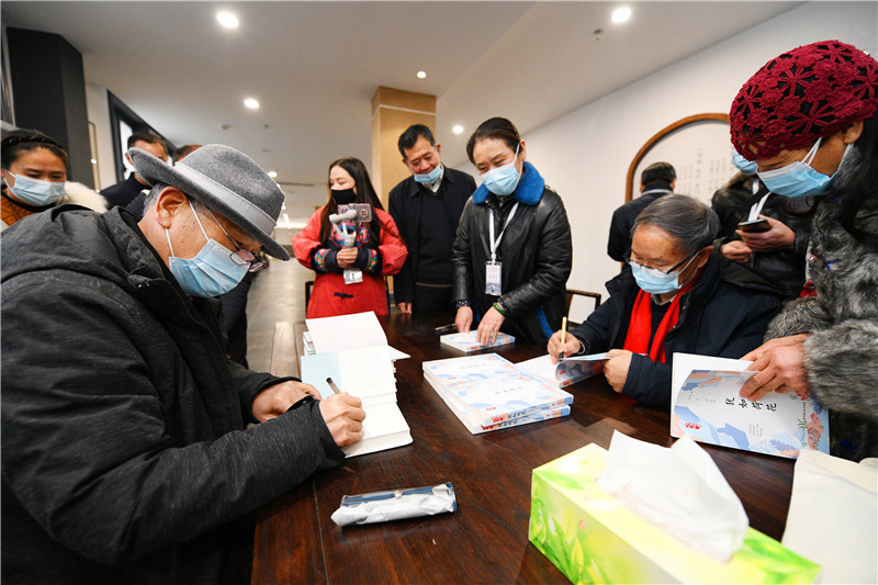 返鄉(xiāng)參加開館儀式的著名作家劉慶邦、墨白為讀者簽字贈書
