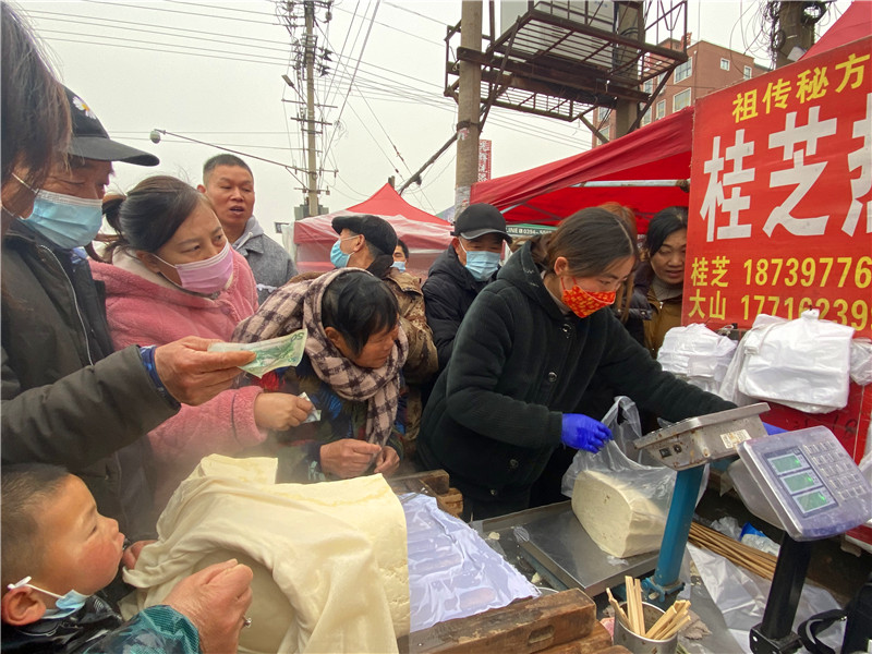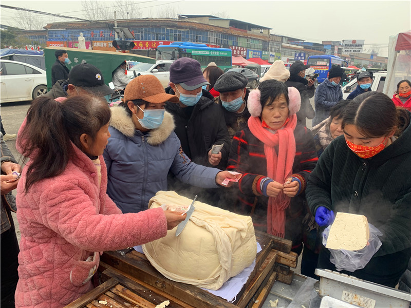 在固墻鎮(zhèn)的集市上,“桂枝熱豆腐”攤位前的顧客絡(luò)繹不絕?!敖o我來50塊錢的豆腐”“我要20斤,先給我切豆腐吧”“我要30斤,多少錢”……人群將豆腐攤里三層外三層圍了起來,從人群外朝里看看不見豆腐,只看到豆腐攤里冒出來的團(tuán)團(tuán)熱氣。“等了半個小時了,剛才那一盒豆腐沒輪到我就賣完了,這才搶到手?!备浇拇迕駰畲鬆斈弥鴦傎I的豆腐高興地說。“我從鹿邑來的,姐姐在里面擠著買豆腐,我在這兒等她呢?!?歲的張家瑞說,她每年放寒假都會和家人一起到固墻來探親,過年的時候逛逛集市,順便買些豆腐帶回鹿邑。