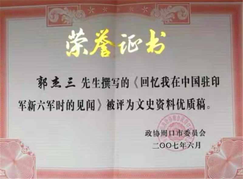 2005年9月3日,時(shí)任中共中央總書記、國家主席、中央軍委主席胡錦濤發(fā)表了《在紀(jì)念中國人民抗日戰(zhàn)爭暨世界反法西斯戰(zhàn)爭勝利60周年大會(huì)上的講話》,正視了正面戰(zhàn)場(chǎng)國民黨軍隊(duì)抗戰(zhàn)的歷史。之后,父親才給我講述他遠(yuǎn)征抗日的經(jīng)歷,并撰寫了《回憶我在中國駐印軍新六軍時(shí)的見聞》一稿,刊登在2007年《周口文史資料》上。政協(xié)為表彰父親的貢獻(xiàn),特別頒發(fā)了“文史資料優(yōu)質(zhì)稿”獎(jiǎng)狀。