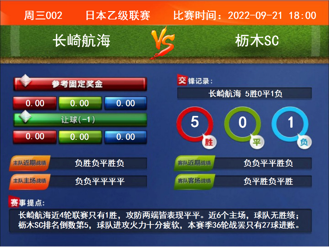 比賽時(shí)間:2022-09-21 18:00賽事提點(diǎn):長(zhǎng)崎航海近4輪聯(lián)賽只有1勝,攻防兩端皆表現(xiàn)平平。近6個(gè)主場(chǎng),球隊(duì)無勝績(jī);櫪木SC排名倒數(shù)第5,球隊(duì)進(jìn)攻火力十分疲軟,本賽季36輪戰(zhàn)罷只有27球進(jìn)賬。