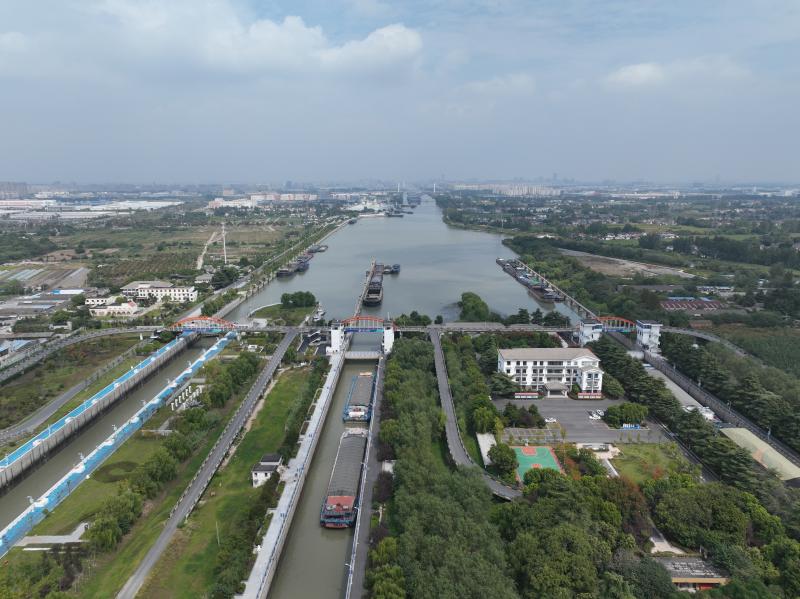 離開施橋船閘,記者一行下行6.5公里,來到京杭大運河和長江交匯口,一艘艘船舶從施橋船閘方向趕來,奔向長江,駛向更遠航程。對面,也有船舶從長江駛入京杭大運河,劈波斬浪,逆流而上。