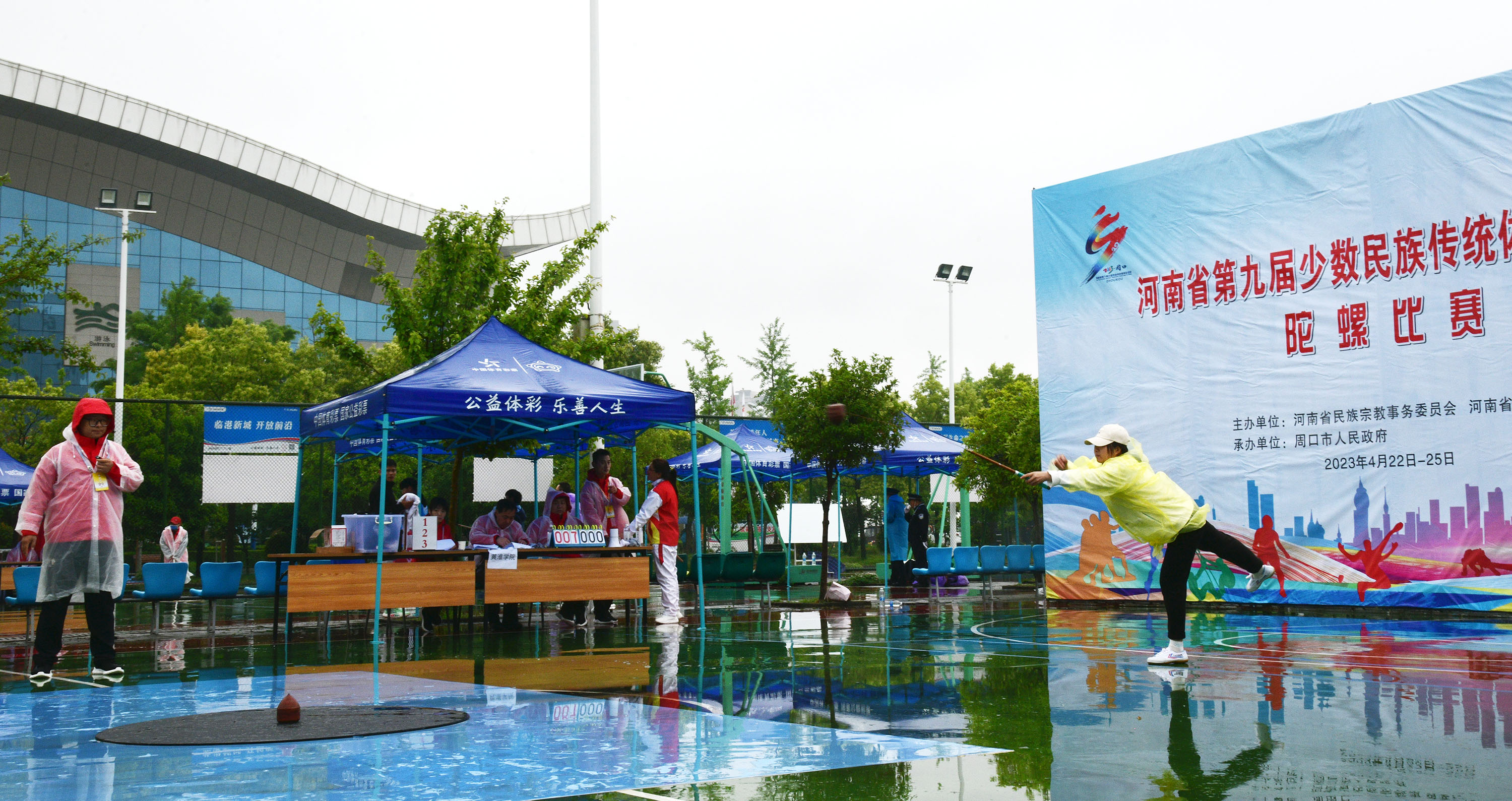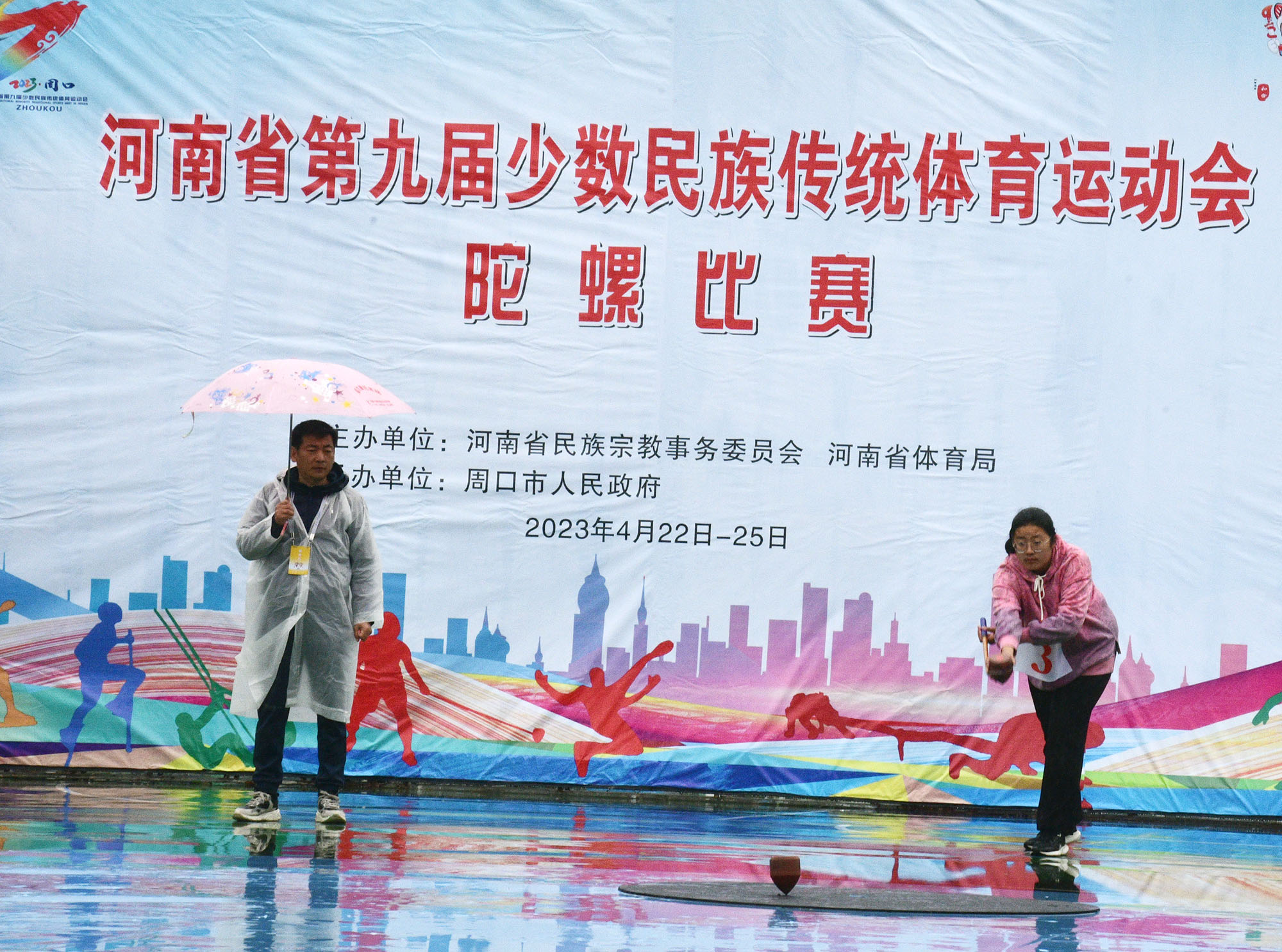 4月23日上午,河南省第九屆少數(shù)民族傳統(tǒng)體育運動會開賽。圖為在市體育中心進(jìn)行的板鞋競速和陀螺比賽。記者 梁照曾 攝