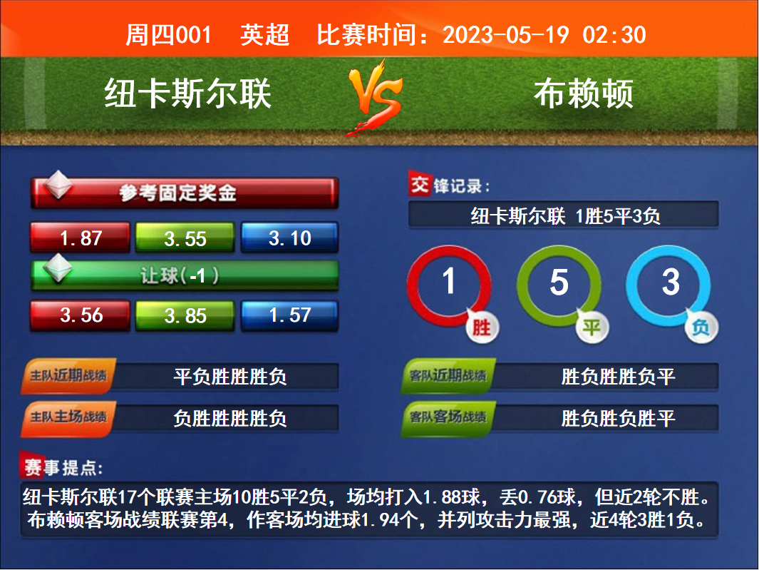 比賽時間:2023-05-19 02:30賽事提點:紐卡斯?fàn)柭?lián)17個聯(lián)賽主場10勝5平2負(fù),場均打入1.88球,丟0.76球,但近2輪不勝。布賴頓客場戰(zhàn)績聯(lián)賽第4,作客場均進(jìn)球1.94個,并列攻擊力最強,近4輪3勝1負(fù)。