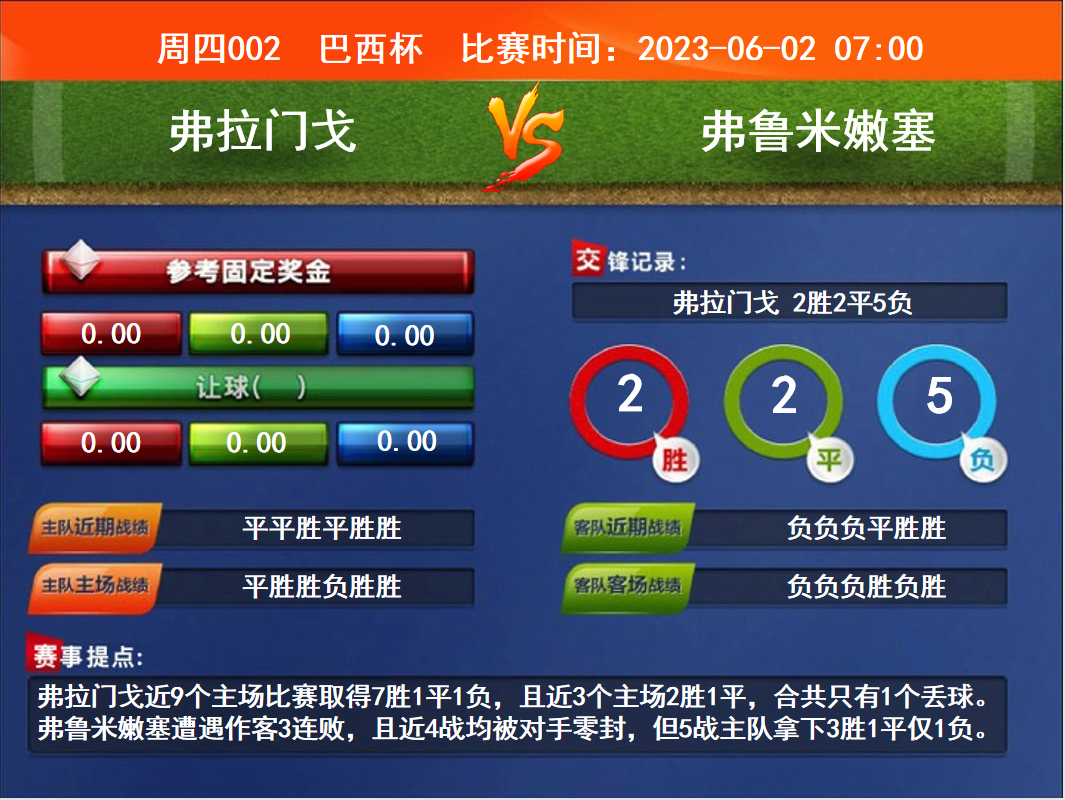 比賽時間:2023-06-02 07:00賽事提點:弗拉門戈近9個主場比賽取得7勝1平1負,且近3個主場2勝1平,合共只有1個丟球。弗魯米嫩塞遭遇作客3連敗,且近4戰(zhàn)均被對手零封,但5戰(zhàn)主隊拿下3勝1平僅1負。