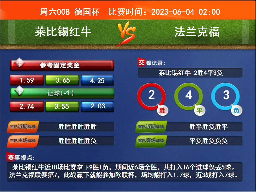 比賽時間:2023-06-04 02:00賽事提點:萊比錫紅牛近10場比賽拿下9勝1負,期間近6場全勝,共打入16個進球僅丟5球。法蘭克福聯賽第7,此戰(zhàn)贏下就能參加歐聯杯,場均能打入1.7球,近3戰(zhàn)打入7球。