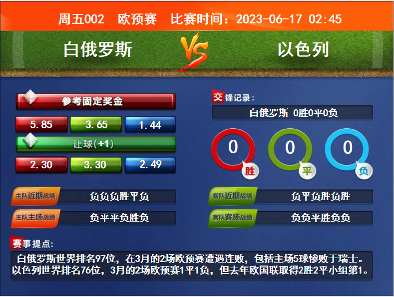 比賽時間:2023-06-17 02:45賽事提點:白俄羅斯世界排名97位,在3月的2場歐預賽遭遇連敗,包括主場5球慘敗于瑞士。以色列世界排名76位,3月的2場歐預賽1平1負,但去年歐國聯取得2勝2平小組第1。
