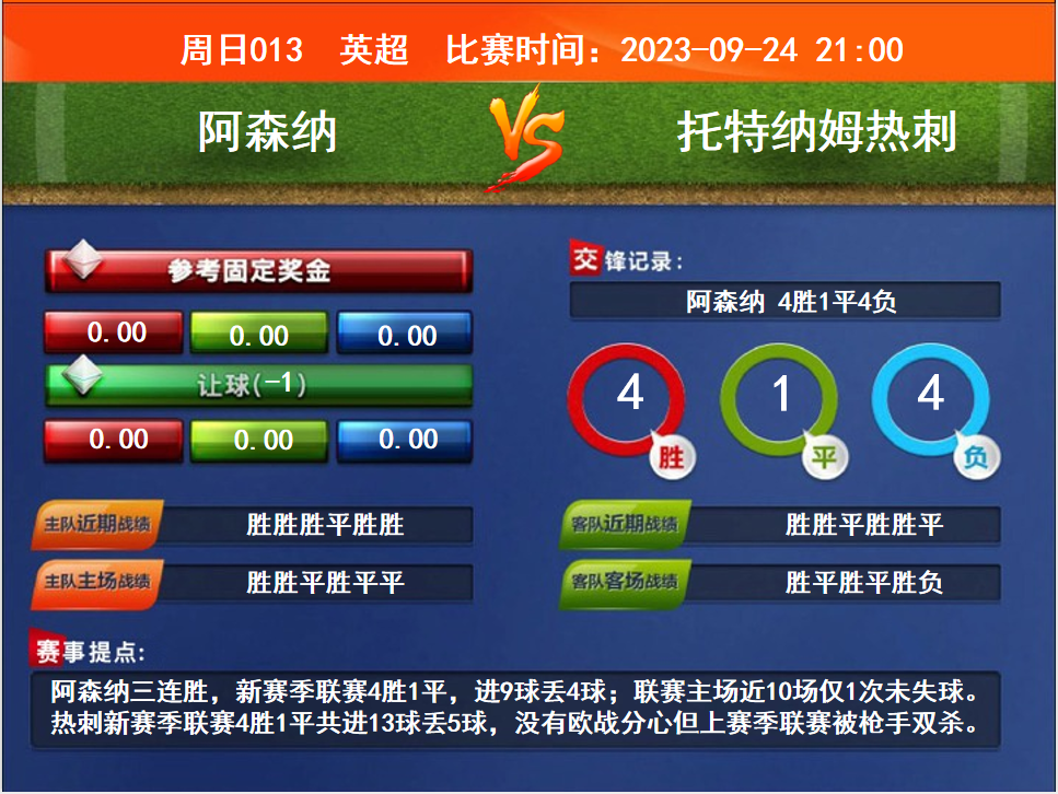 比賽時間:2023-09-24 21:00賽事提點:阿森納三連勝,新賽季聯(lián)賽4勝1平,進(jìn)9球丟4球;聯(lián)賽主場近10場僅1次未失球。熱刺新賽季聯(lián)賽4勝1平共進(jìn)13球丟5球,沒有歐戰(zhàn)分心但上賽季聯(lián)賽被槍手雙殺。
